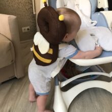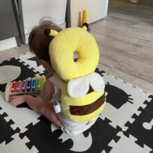 This little bee backpack has literally been a life saver. My 10 month old has been wearing it consistently for the past month and a half and it has saved him from smacking the back of his head on our tile floors too many times to count. He was a little interested in trying to pull it off when we first put it on, but now he wears it all the time and doesn’t seem to even notice it is there. Such a simple, cheap, and effective solution for a common baby issue.