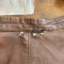It looks better than before. I tried and tried to match the color but knew what I was missing was red for my faux leather jacket that was peeling just under the collar. Finally, I decided to try adding red acrylic paint and it didn’t take long before I had almost exactly the color I needed. I will add a couple more layers and hope it doesn’t look too much like a repair. I couldn’t wear it the way it was so I figured I couldn’t ruin it any worse.