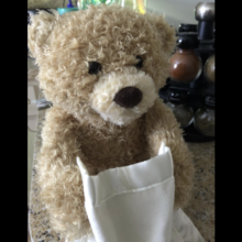 The peek a boo bear was an adorable addition to my 6 month old's collection of stuffed animals. The game of peek a boo is one of her favorites but, she is quite the aggressor LOL. She no longer wished to play the game with the bear and decided she wanted his blanket. Mr. Bear went to cover his eyes and my 6 month snatched his blanket from detaching it from one of his cute unsuspecting paws. It's an easy fix. The voice over is so precious. It would be awesome if there was an option to order the bear with your child's name in place of "baby." I'd definitely order this product for future babies in my family. It's a keeper. Thank you for producing an adorable keepsake!!