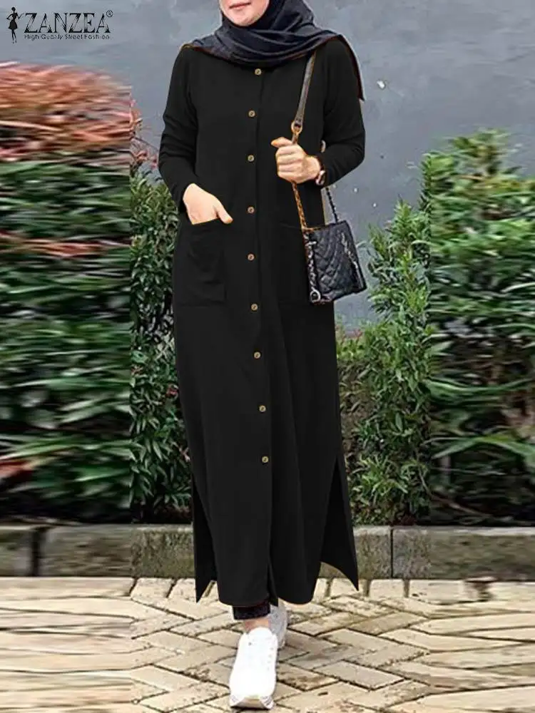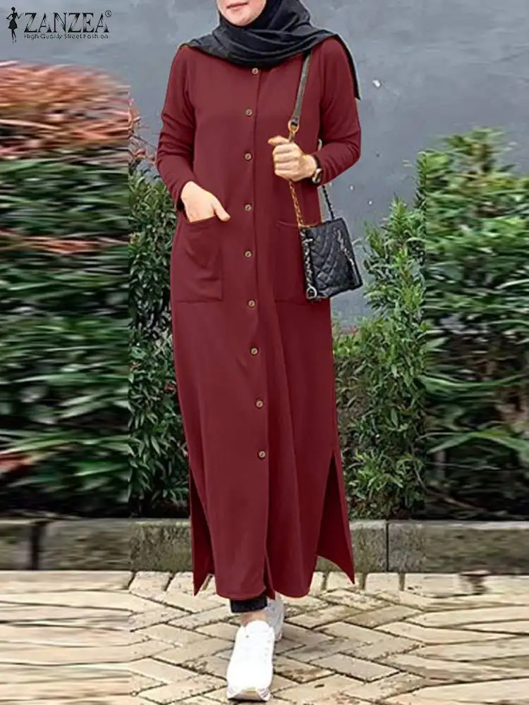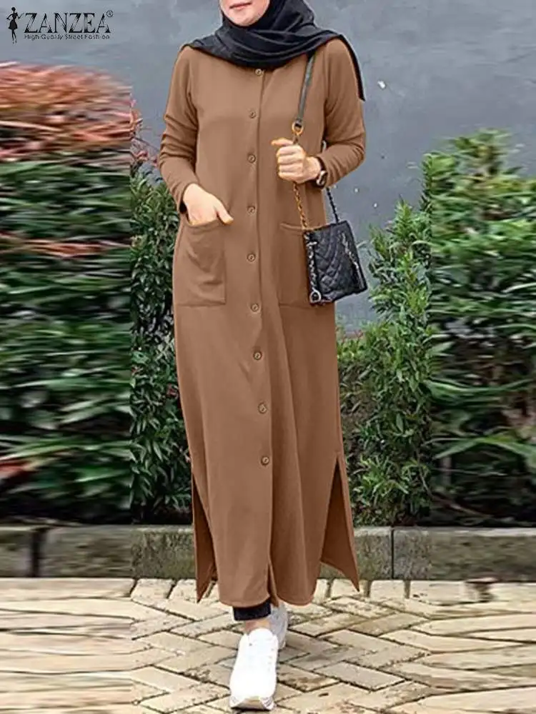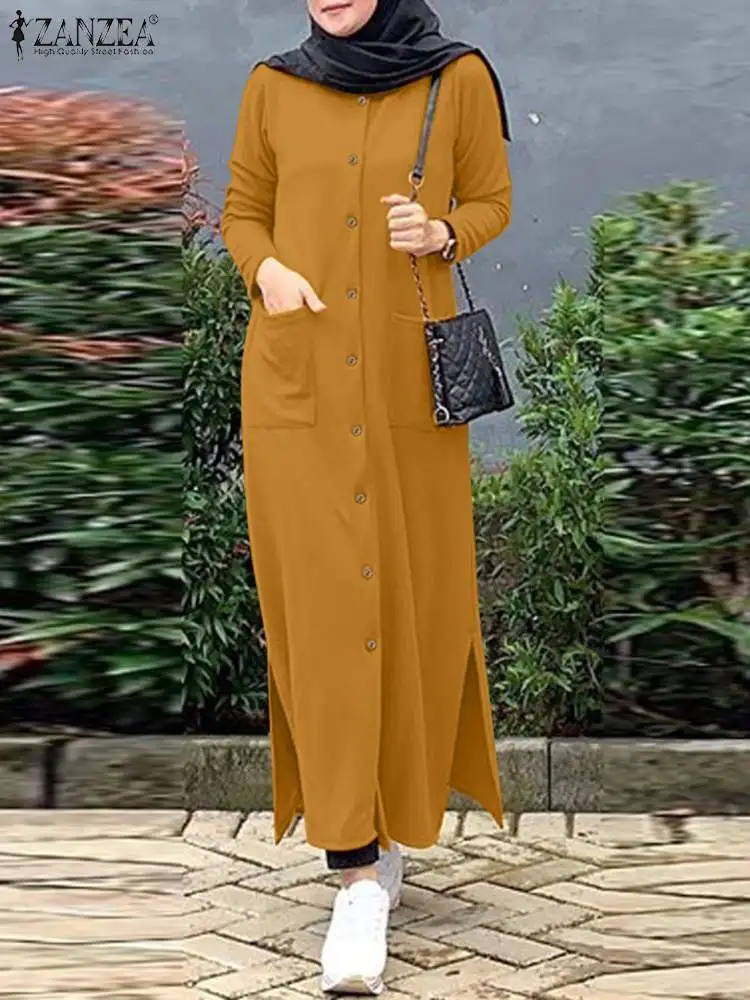Material:100% Polyester Colors:Black,Khaki,Wine Red,Dark Green,Yellow Sleeve Length:Full Sleeve Neckline:O-Neck Pattern:Solid Color Length:Mid-Calf Length Buckle chain:Button Down Front Thickness:Thin Decoration:Side Pockets Style:Leisure,Bohemian,Retro,Europe,Muslim Dress Abaya Kaftan Season:Spring,Autumn,Winter Occasion:Family,Party,Beach,Wedding,Holiday,Employment Label: Yes Attentions: 1.The Real Object May Exist Slightly Colors Differences Compared To Images As Different Computers Display.Caution If Minding,Thanks. 2.There Might Be A Manual Measuring 1-3 cm Error.Sorry For Any Inconvenience. 3.Please Prevail On Real Item, Model Images For Reference Only. 4.Attention!!!Please check the size chart carefully before placing the order.