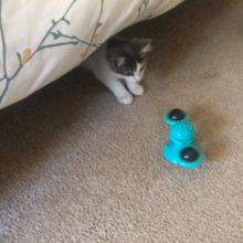My cat just loves this toy! We have it on the window by our bathtub and she’s always running to spin the toy. She even rubs her head on the center to itch her head which she never does with other cat toys. I love the little blinking ball that goes inside one of the sides of the spinners. My cat will watch the lights blink and go back to spin the toy so they will blink again. Definitely keeps her interest and worth every penny! Highly recommend!